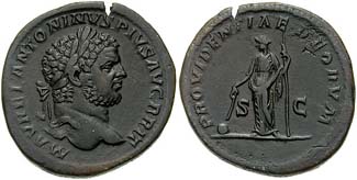 CARACALLA. 198-217 AD. Æ Sestertius (26.85 gm). Struck 213 AD. M AVREL ANTONINVS PIVS AVG BRIT, laureate, bearded, mature bust right / PROVIDENTIAE DEORVM SC, Providentia standing slightly left, holding sceptre and wand over globe. RIC IV 511a; BMCRE 242; Cohen 532. (Image courtesy CNG) | |