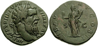 PERTINAX. 193 AD. Æ Sesterius (19.98 gm). IMP CAES P HELV PERTINAX AVG, Laureate head right / LIB AVG TR P COS II, Libertas standing half-left, holding abacus and cornucopiae. RIC IV 18; Woodward, Pertinax, pg. 95 (dies 13/C); BMCRE 39 (same obverse die); Cohen 25. (Image courtesy CNG) | |