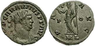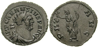 CARAUSIUS. 287-293 AD. Antoninianus (4.91 gm). London mint. IMP CARAVSIVS P F AVG, radiate, draped and cuirassed bust right / PAX AVG, Pax standing left, holding branch and sceptre. RIC V 881. (obv. legend). |