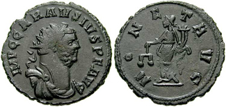 Carausius. 287-293 AD. Antoninianus (4.34 gm). London (?) mint. IMP C CARAVSIVS P F AVG, radiate, draped, and cuirassed bust right / MONETA AVG, Moneta standing left, holding scales and cornucopiae. RIC V pt. 2, 855 var. (obv. legend). | |