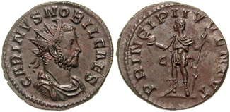 CARINUS, as Caesar. 282-283 AD. Antoninianus (4.36 gm). Lugdunum mint. CARINVS NOBIL CAES, radiate and cuirassed bust left, holding spear and shield / PRINCIPI IVVENTVT, Carinus standing left, holding globe and spear; C. RIC V 150; Gricourt 28; Cohen 92. (Image courtesy CNG) | |