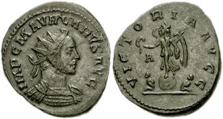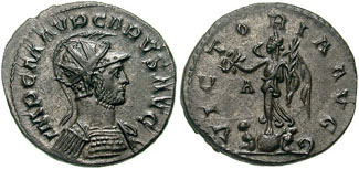 CARUS. 282-284 AD. Antoninianus (22mm, 3.76 gm). Lugdunum (Lyon) mint. Struck 282 AD. IMP C M AVT CARVS AVG, helmeted, radiate, and cuirassed bust right / VICTORIA AVG, Victory standing left on globe, holding wreath and palm; two bound captives seated at her feet; A. RIC V 18; Venèra -; Cohen 88. (Image courtesy CNG) | |