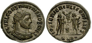 Constantius Chlorus (305-306 AD). Antoninianus (4.01 gm). Antioch mint. FL VAL CONSTANTIVS NOB CAES, radiate and cuirassed bust right / IOV ET HERCV CONSER AVGG, Hercules standing left, holding lion's skin and club, handing Victory, who holds wreath, to Jupiter standing right, holding spear and globe; (crescent)/S/XXI. RIC V pt. 2, 673. (Image courtesy CNG) | |