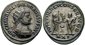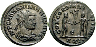 MAXIMIANUS. 286-305 AD. Antoninianus (4.15 gm). Cyzicus mint. IMP C M A MAXIMIANVS AVG, radiate, cuirassed, and draped bust right / CONCORDIA MIL-ITVM•, Jupiter standing left, holding sceptre, handing Victory on globe to Maximianus standing right; E/XXI•. RIC V pt. 2, 607; Cohen 53. (Image courtesy CNG) | |