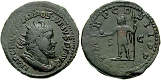 POSTUMUS. 259-268 AD. Æ Double Sestertius (23.09 gm). Struck 261 AD. IMP C M CASS LAT POSTVMVS P F AVG, radiate, draped, and cuirassed bust right / P M TR P COS II P P, Emperor standing left, holding globe and sceptre. RIC V pt. 2, 106; Bastien 63; Elmer 213; Coh. 246. (Image courtesy CNG) | |