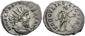 POSTUMUS. Romano-Gallic Emperor, 259-268 AD. AR Antoninianus (22mm, 3.59 g, 6h). Mint II (Cologne). Struck circa 266-267 AD. IMP C POSTVMVS P F AVG, radiate, draped, and cuirassed bust right / SAECVLI FELICITAS, Postumus standing right, holding spear and globe. RIC V 83 and 325; AGK 77; RSC 331a. (Image courtesy CNG) | |