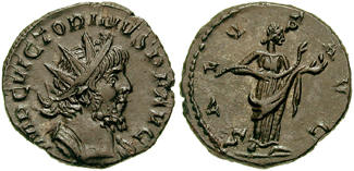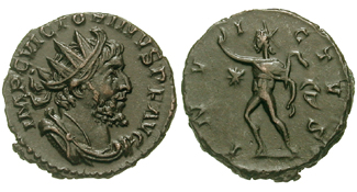 VICTORINUS. 260-269 AD. AE Antoninianus (2.88 gm). Mint city I=Treveri (Trier). Struck 269/270 AD. IMP C VICTORINVS P F AVG, radiate, draped, and cuirassed bust right / INV-I-CTVS, Sol standing left, holding whip; star in left field. RIC V 114; AGK 9b; Cohen 49. (Image courtesy CNG) | |