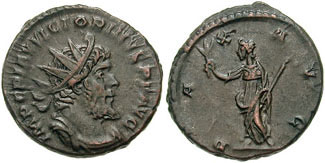 VICTORINUS. 260-269 AD. Antoninianus (19mm, 4.01 gm). Mint city I=Treveri (Trier). Struck 269/270 AD. IMP C PIAV VICTORINVS P F AVG, radiate, draped, and cuirassed bust right / PA-X A-VG, Pax standing left, holding branch and sceptre. RIC V 117; AGK 12c; Cohen 83. (Image courtesy CNG) | |