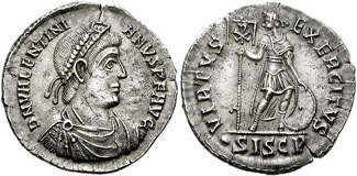 VALENTINIAN I. 364-375 AD. AR Light Miliarense (4.42 gm). Siscia mint. Struck 364-367 AD. D N VALENTINI-ANVS P F AVG, Pearl-diademed, draped, and cuirassed bust right / VIRTVS-EXERCITVS, Valentinian standing facing, head left, holding labarum and resting on shield; •SISCP. RIC IX 10a; RSC 58†d. (Image courtesy CNG) | |||||||||||||||||||||||||||||||||||||||||||
