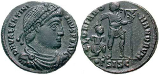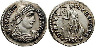 VALENS. 364-378 AD. AR Miliarense (4.40 gm). Siscia mint. Struck 367-375 AD. D N VALEN-S P F AVG, pearl-diademed, draped, and cuirassed bust right / VIRTVS EXERCITVS, Valens standing facing, head left, holding labarum and shield; •SISCP. RIC IX 10b; RSC 71†f; Cohen 71. (Image courtesy CNG) | |||||||||||||||||||||||||||||||||||||||||||