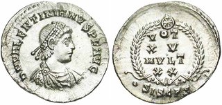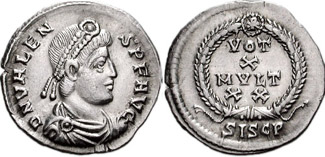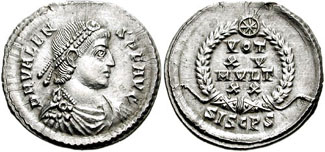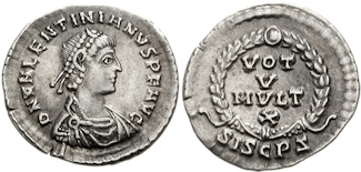 Valentinian II. AD 375-392. AR Siliqua (19mm, 1.61 gm). Siscia mint. Struck 375-378 AD. DN VALENTINIANVS PF AVG, pearl-diademed, draped and cuirassed bust right / VOT/XV/MVLT/XX in four lines within wreath;• SISCPS. RIC IX 19c (Image courtesy Jean Elsen & ses Fils S.A.) | |||||||||||||||||||||||||||||||||||||||||||