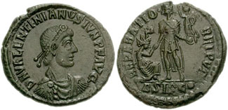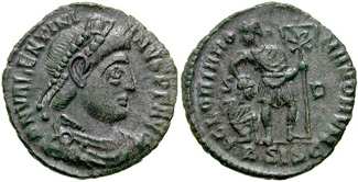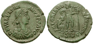 Valentinian I. AD 364-375. Æ Follis (19mm, 3.45 g, 12h). Sirmium mint, 1st officina. Struck 25 February-December AD 364. Diademed, draped, and cuirassed bust right / Valentinian standing facing, head right, holding victoriola and labarum; ASIRM. RIC IX 6a.1; LRBC 1627. (Image courtesy CNG) | |||||||||||||||||||||||||||||||||||||||||||