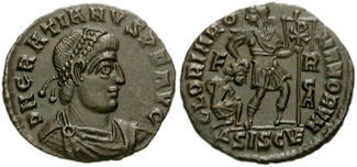 Gratian. AD 367-383. Æ 18mm (2.07 g, 6h). Siscia mint, 4th offcina. Struck circa AD 367-375. DN GRATIANVS P F AVG, Pearl-diademed, draped, and cuirassed bust right / GLORIA-ROMANORVM, Gratian standing right, head left, holding bound captive kneeling at feet right, and labarum; F-D/-P/ ΔSISCE. RIC IX 14d. (Image courtesy Jean Elsen & ses Fils S.A.) | |||||||||||||||||||||||||||||||||||||||||||
