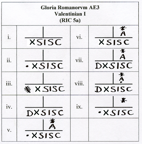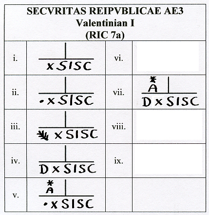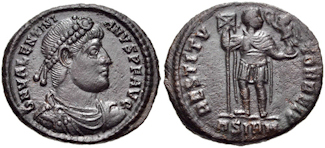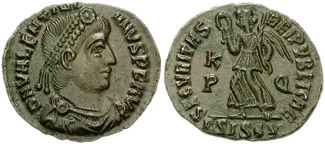 VALENS. 364-378 AD. AE 18mm (3.10 gm). Siscia mint. Struck 367-375 AD. D N VALENS P F AVG, pearl-diademed, draped, and cuirassed bust right / SECVRITAS REI-PVBLICAE, Victory advancing left, holding wreath and palm; */D-S/ASISC. RIC IX 15b; LRBC 1322. (Image courtesy CNG) | |||||||||||||||||||||||||||||||||||||||||||