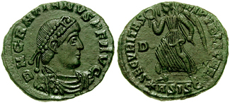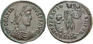 GRATIAN. 367-383 AD. Æ 17mm (2.67 gm). Siscia mint. Struck 367-375 AD. DN GRATIANVS P F AVG, pearl-diademed, draped, and cuirassed bust right / SECVRITAS REI PVBLICAE, Victory advancing left, holding wreath and palm; D-//*ASISC. RIC IX 15(c)xi; LRBC 1310. (Image courtesy CNG) | |||||||||||||||||||||||||||||||||||||||||||