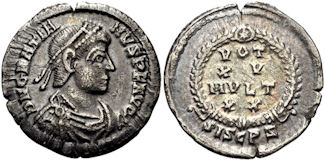 Valentinian II. AD 375-392. AR Siliqua (17mm, 1.59 g, 7h). Siscia mint. Struck AD 378-383. D N VALENTINIANVS P F AVG, pearl-diademed, draped, and cuirassed bust right / VOT / V / MVLT / X in four lines; all within wreath; SISCPZ (Z reversed). RIC IX 24a; RSC 66†c. (Image courtesy CNG) | |||||||||||||||||||||||||||||||||||||||||||