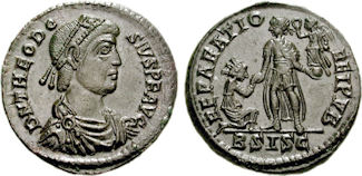 Theodosius I. AD 379-395. Æ 24mm (6.09 g, 1h). Siscia mint, 2nd officina. Struck AD 378-383. DN THEODO-SIVS P F AVG, Pearl-diademed, draped, and cuirassed bust right / REPARATIO-REIPVB, Theodosius, in military outfit, standing left, raising kneeling Oikoumene and holding Victory on globe; BSISC. RIC IX 26c2; LRBC 1514. (Image courtesy CNG) | |||||||||||||||||||||||||||||||||||||||||||