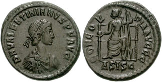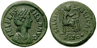 AELIA FLACCILLA, wife of Theodosius I. Æ 12mm (1.18 gm). Siscia mint. Struck circa 383-384 AD. AEL FLAC-CILLA AVG, diademed and draped bust right / SALVS REIPVBLICAE, Victory seated right, inscribing shield; ASISC•. RIC IX 35.3. (Image courtesy CNG) |
