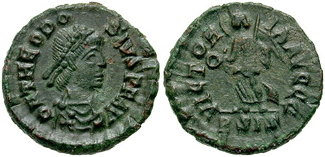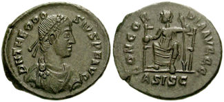 Theodosius I. AD 379-395. Æ 18mm (2.56 g, 6h). Siscia mint, 1st officina. Struck AD 379-383. DN THEODO-SIVS P F AVG, Pearl-diademed, draped and cuirassed bust right / CONCOR-DIA AVGGG, Roma seated facing, head left, holding globe and reversed spear; ASISC. RIC IX 27d.1; LRBC 1518. (Image courtesy CNG) |