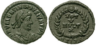 VALENTINIAN II. 375-392 AD. Æ 15mm (1.61 gm). Siscia mint. Struck 379-383 AD. D N VALENTINIANVS IVN P F AVG, pearl-diademed, draped, and cuirassed bust right / VOT/V/MVLT/X in four lines within laurel wreath; ASISC•. RIC IX 29c.3; LRBC 1549. (Image courtesy CNG) |