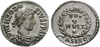 Theodosius I. AD 379-395. Æ 14mm (1.50 g, 12h). Siscia mint, 1st officina. Struck AD 379-383. D N THEODO-SIVS P F AVG, pearl-diademed, draped, and cuirassed bust right / VOT/V/MVLT/X in four lines in wreath; ASISC. RIC IX 29d.1; LRBC 1546. (Image courtesy CNG) |