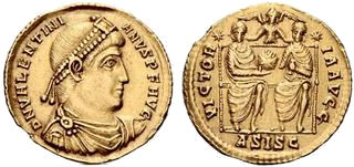 VALENTINIAN. 364-375 AD. Solidus (Gold, 4.44 g 12), Siscia, 364. D N VALENTINI-ANVS P F AVG Diademed, draped and cuirassed bust of Valens to right. / VICTORIA AVGG, Two emperors seated facing on throne, holding globe between them; above, half-length figure of Victory facing. ASISC. RIC 2a. C. 43-44. (Image courtesy Numismatica Ars Classica) | |||||||||||||||||||||||||||||||||||||||||||
