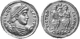 VALENS. 364-378 AD. Solidus (Gold, 4.44 g 12), Siscia, 364. D N VALENS P F AVG Diademed, draped and cuirassed bust of Valens to right. / VICTORIA AVGG, Two emperors seated facing on throne, holding globe between them; above, half-length figure of Victory facing. "wreath"SISC·. C. 53. Dep. 25/1. RIC 2b-3. (Image courtesy Numismatik Lanz München) | |||||||||||||||||||||||||||||||||||||||||||