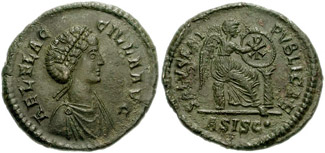 AELIA FLACCILLA, wife of Theodosius I. Æ 12mm (1.18 gm). Siscia mint. Struck circa 383-384 AD. AEL FLAC-CILLA AVG, diademed and draped bust right / SALVS REIPVBLICAE, Victory seated right, inscribing shield; SISC•. RIC IX 35.3. (Image courtesy CNG) |