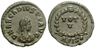 Arcadius. AD 383-408. Æ 12mm (0.99 g, 12h). Siscia mint, 1st officina. Struck 25 August AD 383-summer 387. D N ARCADIVS P F AVG, Pearl diademed, draped, and cuirassed bust right / VOT/V in two lines within wreath; ASIS•. RIC IX 36.1; LRBC 1565. (Image courtesy CNG) | |||||||||||||||||||||||||||||||||||||||||||