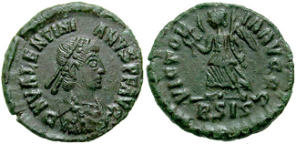 VALENTINIAN II. 375-392 AD. Æ 13mm (1.03 gm). Siscia Mint. Struck 384-387 AD. D N VALENTINI-ANVS P F AVG, diademed, draped and cuirassed bust right / VICTORIA AVGGG, Victory advancing left; BSIS. RIC IX 39a(1). (Image courtesy CNG) |