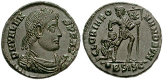 VALENTINIAN I. 364-375 AD. Æ 18mm (2.10 gm). Struck 364-367 AD. Siscia mint. D N VALENTINI-ANVS P F AVG, diademed, draped and cuirassed bust right / GLORIA RO-MANORVM, Valentinian standing facing, head left, holding labaraum and dragging captive; S-D/BSISC. RIC IX 14a.xiii; LRBC 1315 var. (letters in field reversed). (Image courtesy CNG) | |||||||||||||||||||||||||||||||||||||||||||