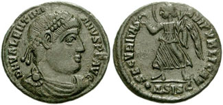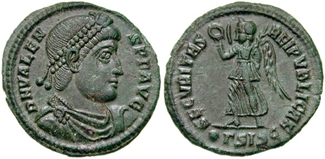 Valens. 364-375 AD. Æ 19mm (2.52 gm). Siscia mint. Struck 364-367 AD. D N VALEN-S P F AVG, pearl diademed, draped and cuirassed bust right / SECVRITAS REIPVBLICAE, Victory advancing left, holding wreath and palm; •GSISC. RIC IX 7b.ii; LRBC 1278. (Image courtesy CNG) | |||||||||||||||||||||||||||||||||||||||||||