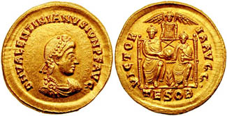VALENTINIAN II. 375-392 AD. AV Solidus (4.46 gm). Thessalonica mint. Struck 379 AD. D N VALENTINIANVS IVN P F AVG, pearl-diademed, draped, and cuirassed bust right / VICTOR-IA AVGG•, Gratian and Valentinian seated facing, holding globe between them; behind and between them, Victory is standing with outspread wings, palm below; TESOB. RIC IX 34b2 corr. (• placed in mintmark); Depeyrot 35/2; Cohen 36. (Image courtesy CNG) | |