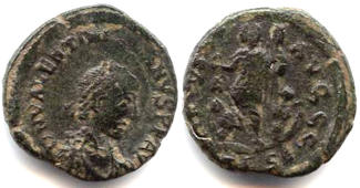 Valentinian II. AD 375-392. Æ3 (16mm, 2.14 grams). Thessalonica mint. Struck AD 389-392. D N VALENTINI-ANVS P F AVG, pearl diademed, draped, cuirassed bust right / VIRTVS - AVGGG, emperor standing left on prow of ship, head right, foot on captive & holding phoenix on globe & standard; Victory sits at the helm, A to left, TES in ex. RIC X 61a. (Image courtesy ACC) | |