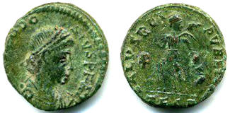 Theodosius I. AD 379-395. Æ3 (18mm, 2.91 grams). Thessalonica mint. Struck AD 389-392. D N THEODO-SIVS P F AVG, pearl diademed, draped, cuirassed bust right / VIRTVS - AVGGG, emperor standing left on prow of ship, head right, foot on captive & holding phoenix on globe & standard; Victory sits at the helm, B to left, TES in ex. RIC X 61b. (Image courtesy ACC) | |