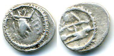 The types might be presenting issues from two distinct mints or workshops, or perhaps they are separated in time - the small head on the obverse is never paired with the "trident" reverse, and is always paired with the "altar" type reverse. The large decorated head is always paired with the "trident" type obverse, and is never paired with the "altar" obverse (see the table below). This suggests that the two types were not issued, but followed each other (with the ones with the altar, perhaps, being the earlier ones). The rare coins with a small head on obverse but with trident/inscriptions on reverse are probably the "transitional issues".