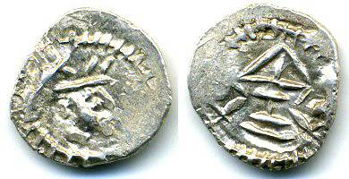 Type 2.1: Obv: Crowned bust right, surrounded by a rayed border. Rev: Fire altar flanked by two seated attendants, surrounded by a rayed border. Pieper's New types of early medieval silver portrait coins from northern Pakistan' in ONS-NL 181 (2004) type - (photo courtesy ACC).