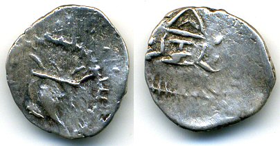 These coins with a left-facing bust are rare and are of the crudest manufacture - the inscription is very crude and is usually incomplete.