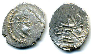 Type 3.3.19: Obv: Crowned bust right ("open rectangle" crown with a crescent and dot inside), surrounded by a dotted border. Rev: Trident with a surrounding Brahmi inscription YaShaaDiTya. Pieper's New types of early medieval silver portrait coins from northern Pakistan' in ONS-NL 181 (2004) type 4var(?). (Photo courtesy ACC)