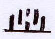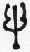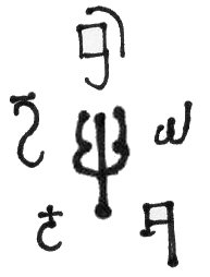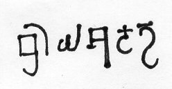 The other type is more common and represented the bulk of the hoard. This reverse shows a up-pointing trident with curved prongs, surrounded by 5 letters. The letters are late Brahmi script, commonly used in the 6th (and later) century AD. The inscription (lined up) is shown below.