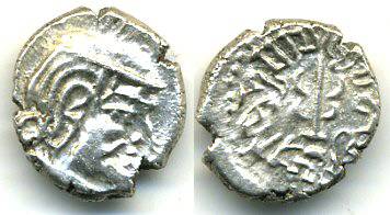 | Silver drachm, Maitrakas of Valabhi (470-800 AD), India. Bust of king in Kshatrapa or Gupta style right / Trident with curved prongs and side-arm, Brahmi legend: Rajno Mahakshatrapa ramaditya bhakta Mahasamanta Sri Sarvva Bhattarakasa. 13mm, 1.9 grams. Mitchiner ACW 4892 - 4896. (Images and descriptions courtesy ACC). | |