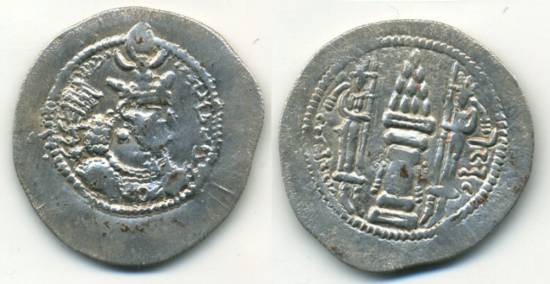 | Silver drachm of Yazdgard II (438-457 AD), Sassanian Empire. Crowned bust of Yazgard right, name in Pahlavi / Pahlavi word 'nwky' (good) to right in place of mint. Mintless type. 29mm, 3.6 grams. Gobl SN I/1. (Photo and description courtesy ACC) | Hephthalite silver drachm, pre-Gujarat issues, ca.550-650 AD. Sassanian-style bust right, derived from winged-type of Peroz - wearing winged skull-cap, no letter above / Altar with two attendants, crude barbarized inscriptions. 28.5mm, 3.9 grams. Rare! Mitchener 1476. (Photo and description courtesy ACC) | Hephthalite silver drachm, imitation of Peroz, ca.550-650 AD, pre-Saurashtran issue. Sassanian-style bust right, derived from winged-type of Peroz - wearing winged skull-cap, no letter above / Altar with two attendants, crude barbarized inscriptions. 22mm, 4.0 grams. Pre-Saurashtran series, Mitchener 64. (Photo and description courtesy ACC) |