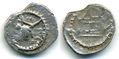 Type 2.6: Obv: Crowned bust right, surrounded by a rayed border. The curved crown is topped with a crescent with a large dot inside. Rev: Fire altar flanked by two seated attendants, surrounded by a rayed border. 12mm, 0.6 grams. Pieper's New types of early medieval silver portrait coins from northern Pakistan' in ONS-NL 181 (2004) type 1. (Photo courtesy ACC).